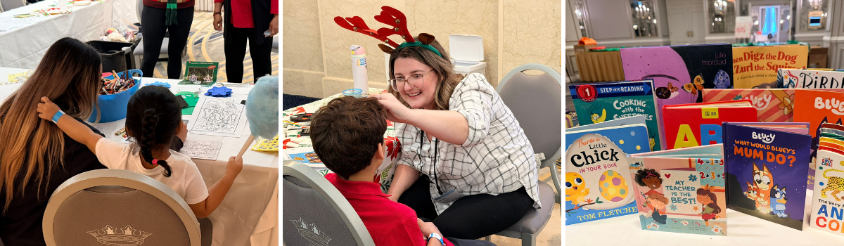 Food and fun are central to creating meaningful holiday experiences. Guests were welcomed with a delicious buffet lunch and a thoughtfully curated range of activities, including face painting, arts and crafts, and time with the beloved Paw Patrol character, Chase. Younger children enjoyed the bouncy castle, while teens connected with peers through gaming and creative henna hand painting. Therapy dogs were also present during the event, providing moments of comfort and calm and helping create a welcoming, inclusive atmosphere for children, youth, and families alike.