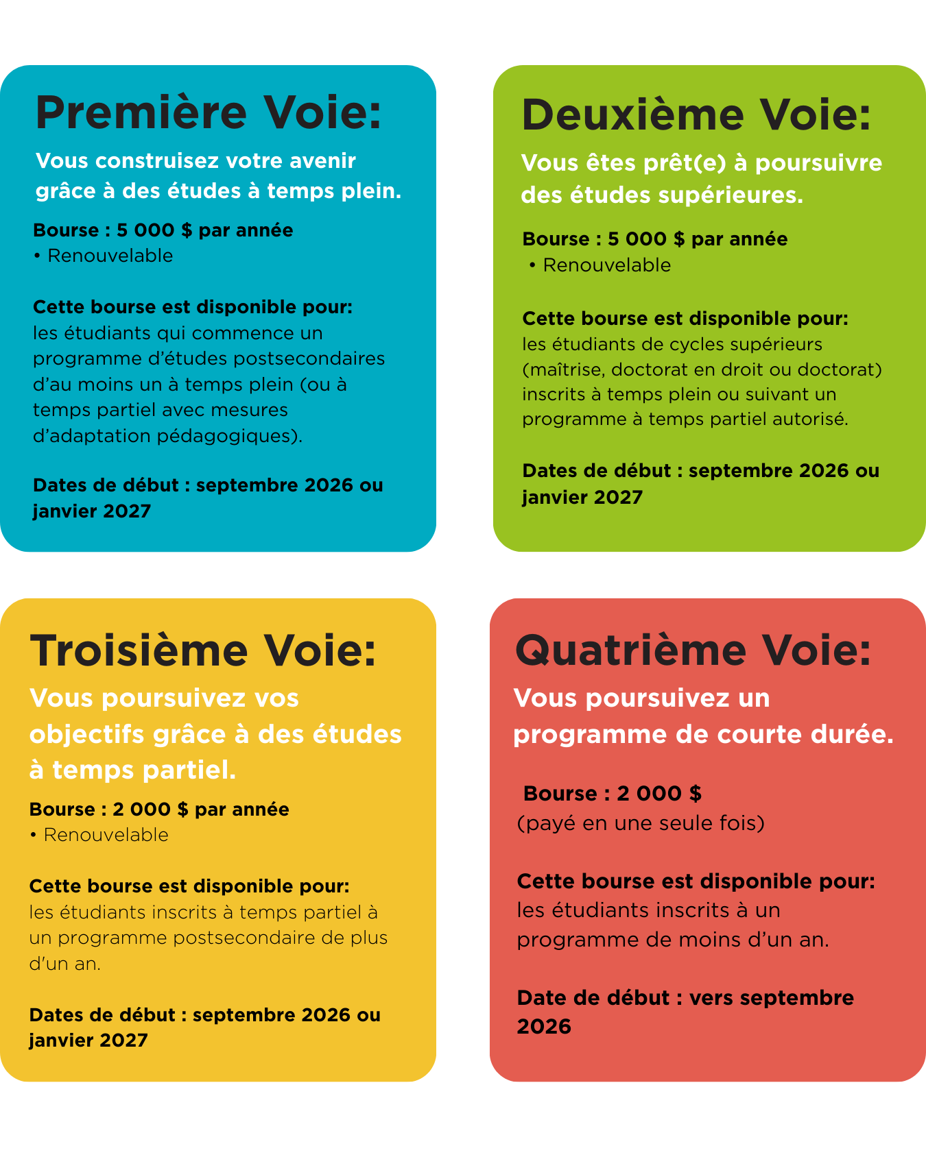 *Au cours de cette année civile, après la fin du semestre en cours ou après le semestre d’été. Si votre programme se termine à la fin du semestre d’automne (décembre) ou plus tard, veuillez attendre pour demander la bourse de fin d’études 2026.
